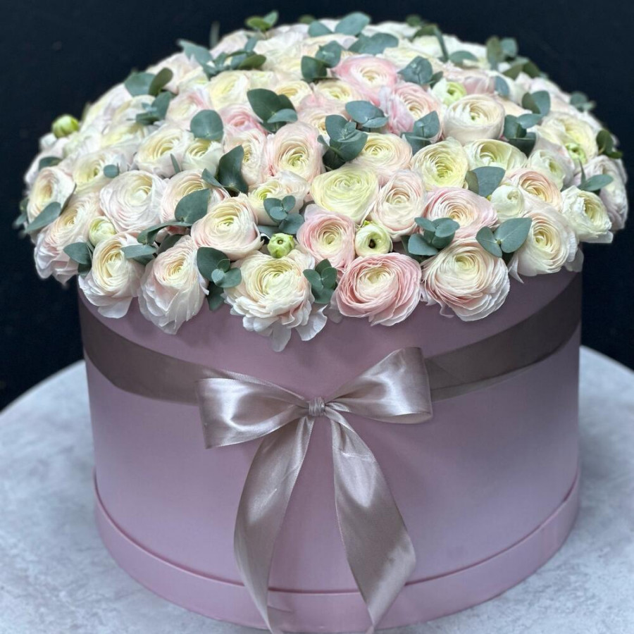 На фото 101 белый ранункулюс в коробке. В составе: ранункулюс 101 шт, оазис флористический 2 шт, шляпная коробка (xl) 1 шт, . Все цветы свежие и ароматные, букет красиво оформлен и отлично подходит для подарка. Доступна доставка цветов или самовывоз.
