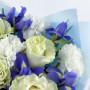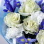 Букет из белых гвоздик, синих ирисов и белых роз в Надыме