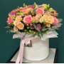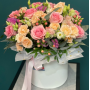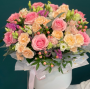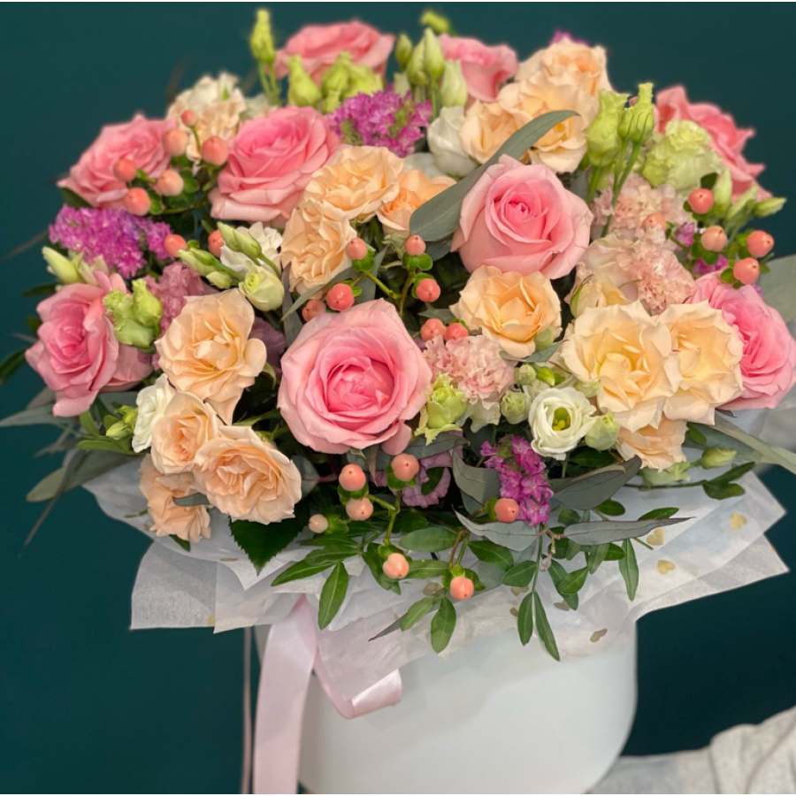 Букет «Романтическая Палитра» — изысканная композиция из одноголовых роз, кустовых роз, эустомы, гиперикума, статицы, писташевой зелени и эвкалипта. Создана для тех, кто ценит нежность и элегантность. Букет сочетает в себе классическую красоту и современный стиль, идеально подходящий для любого особого случая.